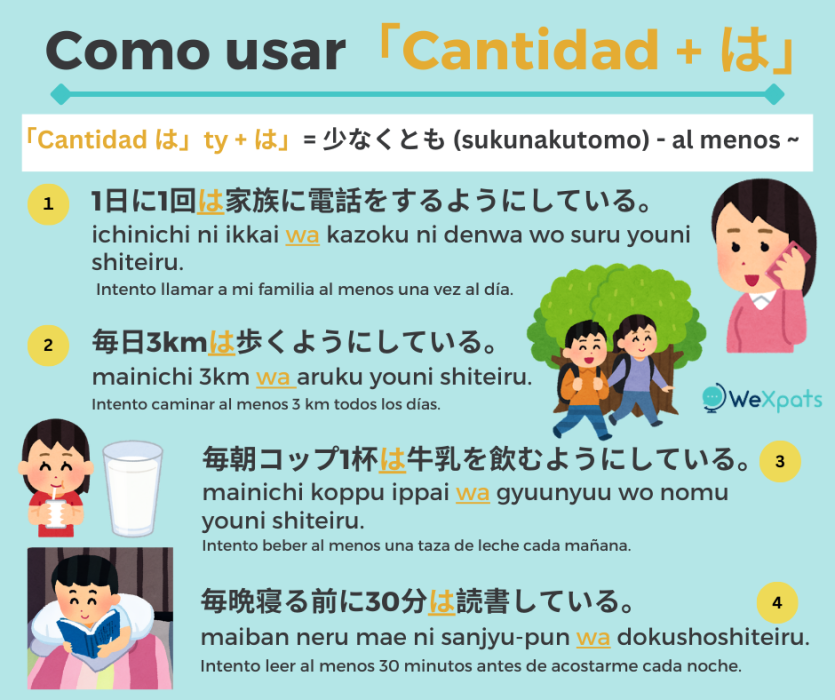 En el nivel N3, la partícula は (wa) puede usarse como「Cantidad + は」para significar "少なくとも (sukunakutomo) - al menos ~". Se utiliza a menudo para expresar un hábito o una acción de la que se es consciente. Nótese que el uso de la partícula は (wa) en este caso es diferente del は (wa) que se conecta a un sustantivo sujeto, como「私は (watashi wa) - Yo soy」.