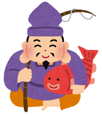 恵比寿 (Ebisu) Es de la época de los Dioses Izanami e Izanagi y es el único Dios con origen puramente japonés. Es el patrón de los pescadores, por tanto es representado con indumentarias de pescador. La cerveza Ebisu lleva su imagen