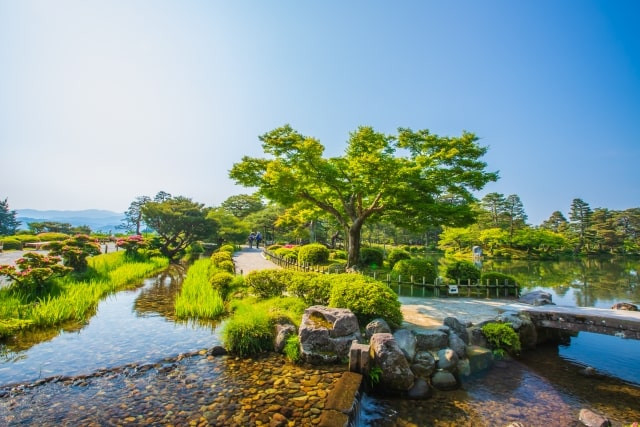 No se persigue la opulencia y el espíritu del wabi-sabi se puede sentir aquí y allá. Kenrokuen en la prefectura de Kanazawa, Okayama Korakuen en la prefectura de Okayama y Mito Kairakuen en la prefectura de Ibaraki son famosos por ser los tres jardines más famosos de Japón.