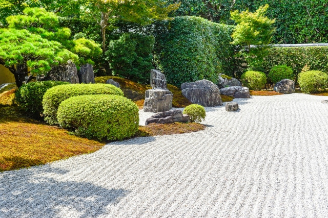 Los jardines japoneses son una forma de arte que expresa artificialmente paisajes como piedras y ríos. Dibuja patrones en la arena para representar arroyos o usa rocas para representar montañas. Varían en tamaño, desde grandes, como parques y museos, hasta pequeños, como los jardines de los templos.