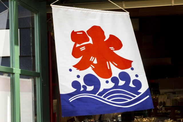 La famosa bandera Kooribata se ve por todas partes en verano, 氷 "hielo" es el ideograma que anuncia que puede pedirse un kakigori. No pertenece a una tienda ni es un logo registrado. Se trata de un signo que proviene de la tradición japonesa del kakigori. Los momentos de calma en el ritual veraniego se consagran gracias al eterno kakigori.