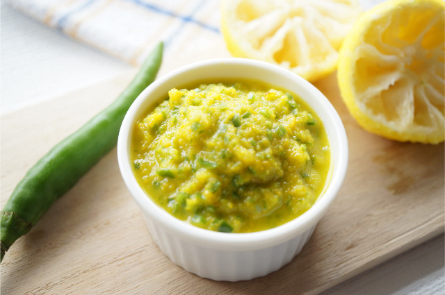 Yuzu kosho es una pasta picante japonesa hecha de yuzu, pimientos y sal. Se puede agregar a muchos platos. Debido a su versatilidad, algunos chefs occidentales también lo agregan a ensaladas y pastas.