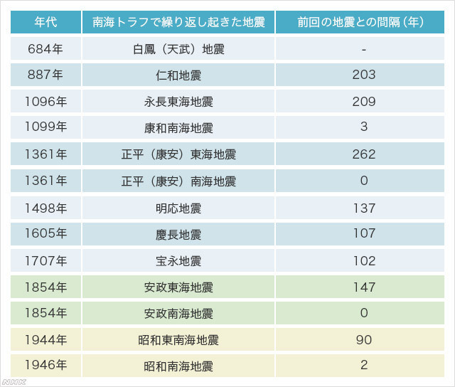 La fosa de Nankai es una fosa submarina situada al sur de la isla de Honshū en Japón, que se extiende desde la costa unos 900 km, desde la bahía de Suruga hasta la costa de Kyushu desde la costa, ha experimentado continuamente grandes terremotos cada 100 a 200 años. En la imagen de arriba podemos ver la lista de los terremotos prominentes.