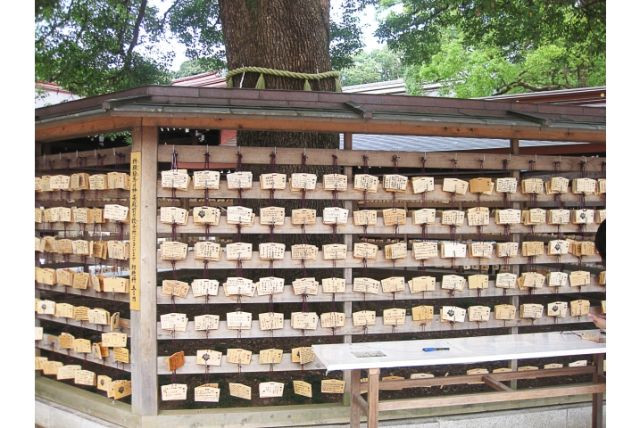Selanjutnya ada juga Ofuda, yang dibungkus sebagian dengan kertas. Pada kertas tersebut terdapat lambang serta nama kuil. Nantinya, para pengunjung bisa menuliskan keinginannya pada kertas tersebut.