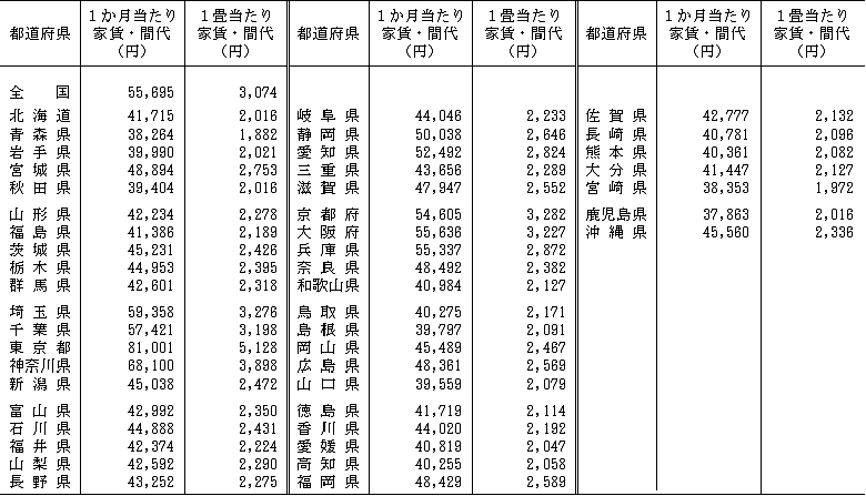 Harga sewa bulanan untuk tempat tinggal disebut “yachin” (家賃) dalam bahasa Jepang. Menurut survei yang dilakukan Biro Statistik Kementerian Dalam Negeri dan Komunikasi (総務省統計局) tahun 2018, rata-rata biaya sewa properti di Jepang diperkirakan sebesar 55.695 yen. Harga sewa properti bervariasi untuk setiap wilayah. Kamu bisa mengecek harga sewa bulanan di tiap prefektur Jepang berdasarkan tabel di bawah ini.