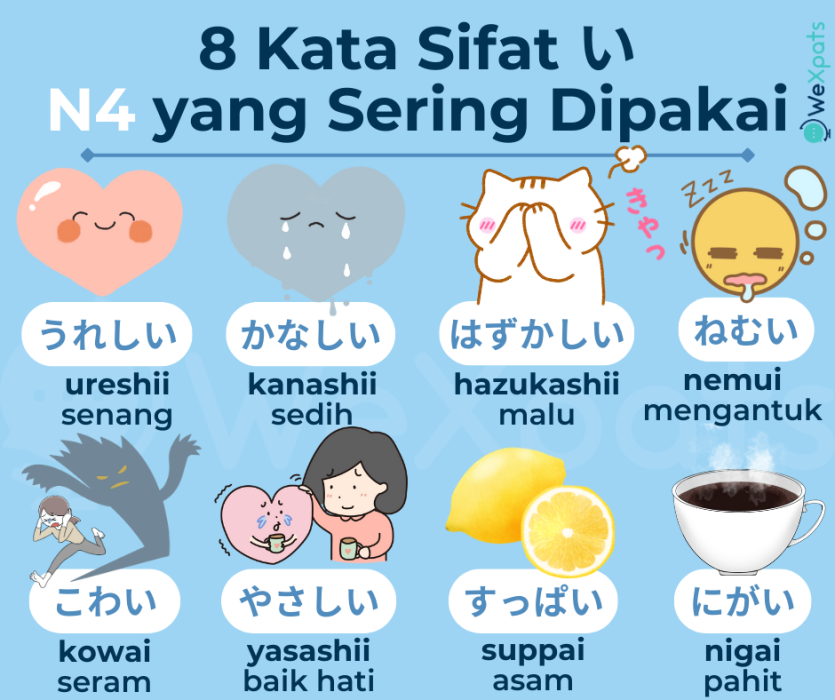 Dengan mempelajari lebih banyak kata sifat dalam bahasa Jepang, kamu akan dapat mengungkapkan perasaan dan kondisi kamu dengan cara yang jauh lebih detail daripada saat mempelajari level N5. Mungkin diperlukan sedikit lebih banyak hafalan kanji untuk menguasai kata sifat, tetapi tidak lebih dari level N5. Kami menyusun 60 daftar kata sifat yang perlu kamu ketahui untuk level N4.