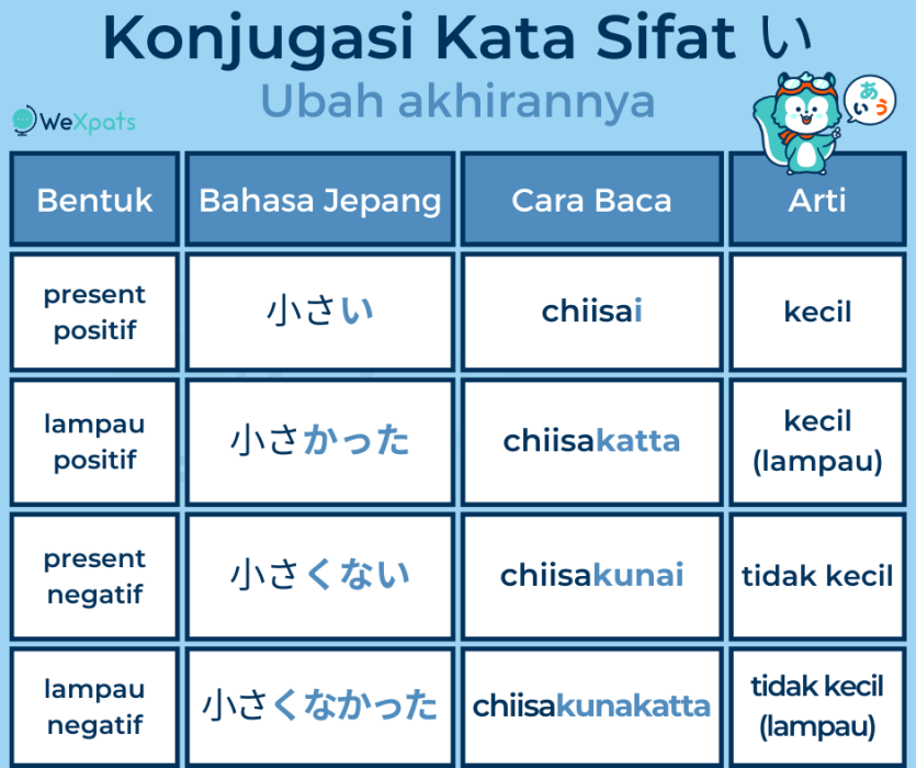 Inilah cara mengkonjugasikan kata sifat い(i). Untuk penjelasan lebih, silakan periksa artikel kata sifat level N5.