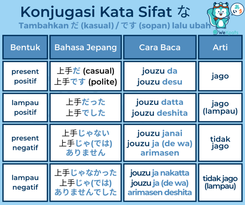 Berikut ulasan singkat tentang cara mengkonjugasikan kata sifat-na. Silakan lihat artikel kata sifat level N5 untuk penjelasan lebih rinci.