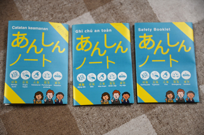 Ini adalah “Anshin Note” atau Catatan Keamanan yang didistribusikan gratis di seluruh Prefektur Kumamoto. Saat gempa terjadi, warga negara asing juga menyampaikan bahwa mereka ingin informasi selain dalam bahasa Jepang, sehingga dibuatlah catatan ini dengan kerjasama dari banyak orang yang tinggal di Kumamoto.