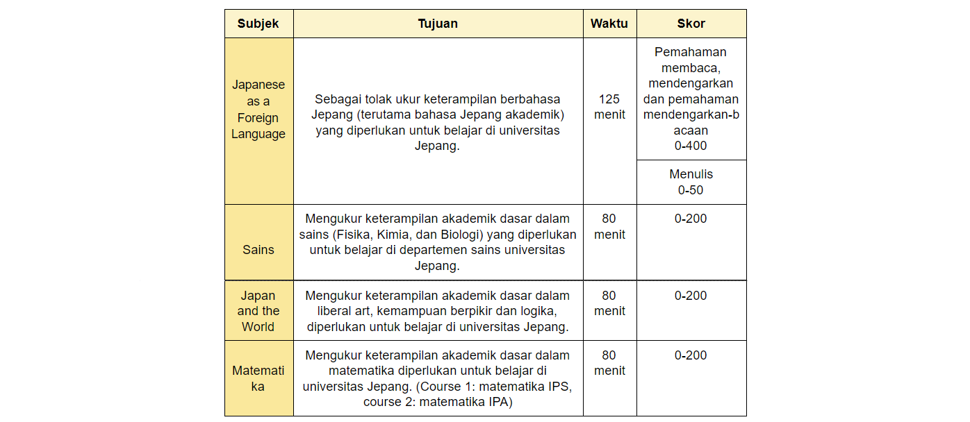 EJU meliputi tes mata pelajaran berikut: Japanese as a Foreign Language, Sains (fisika, kimia dan biologi, Japan and the World, dan matematika. Pelamar memilih mata pelajaran mana yang akan diambil berdasarkan persyaratan universitas Jepang yang ingin mereka masuki. Ujiannya tersedia dalam bahasa Jepang atau bahasa Inggris, dan pelamar dapat memilih saat mendaftar.
