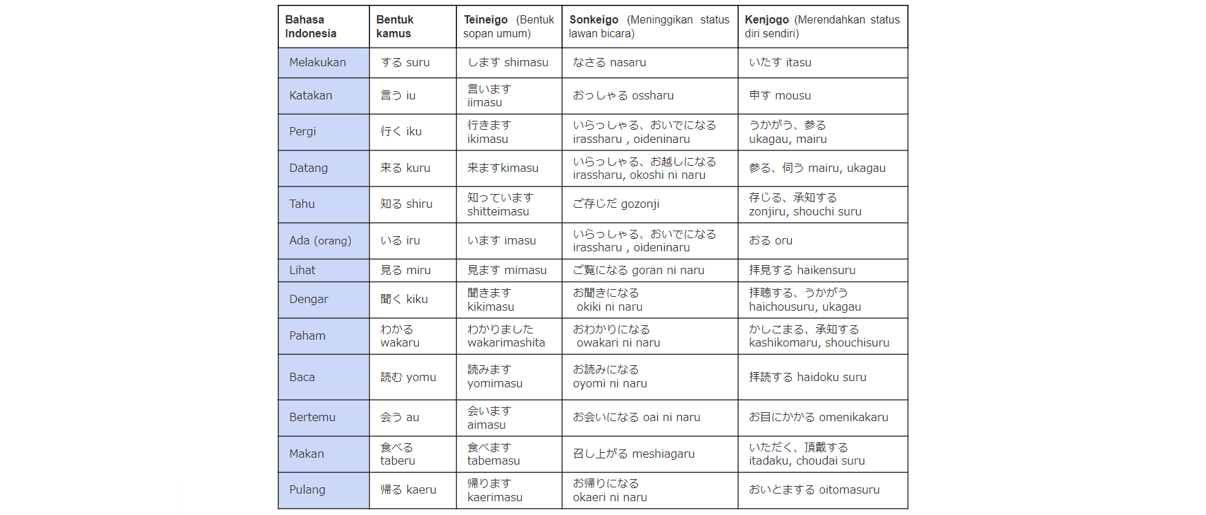 Masih bingung membedakan teineigo, sonkeigo dan kenjogo? Kalau begitu ayo kita bandingkan dengan bahasa Jepang yang biasa kamu pergunakan dalam percakapan sehari-hari. Bukankah bentuk -desu dan -masu saja sudah menjadi sopan? Tidak salah jika kamu menggunakan -desu dan -masu untuk menyopankan kalimatmu atau memberikan rasa hormat pada lawan bicara. Namun, dengan menguasai level bahasa Jepang sopan lainnya, level kemampuan bahasa Jepangmu tidak akan dicap biasa-biasa saja. Apalagi jika kamu sudah tinggal lama di Jepang, penggunakan bahasa Jepang seperti ini sangat penting loh! Perhatikan tabel berikut untuk membantumu memahami ketika bentuk kata sopan dalam bahasa Jepang dengan mudah.