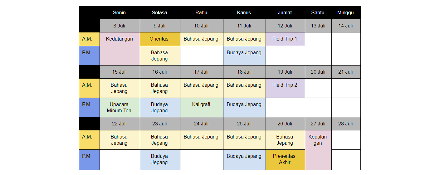 Berikut ini adalah salah satu contoh jadwal summer course selama 3 minggu.