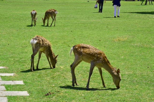 Bukan, ini bukan bahasan tentang rusa di Istana Bogor, melainkan kawanan rusa yang dibiarkan lalu lalang dengan bebas di sekitar taman dan jalanan kota Nara. Ketika kamu menginginkan wisata yang santai, menyegarkan dan tidak memerlukan banyak uang, kunjungilah Nara Park. Bahkan belum saja kamu memasuki area taman, kamu bisa melihat rusa-rusa dengan santainya menyebrang jalan raya. Tidak ada yang memencet klakson, tidak ada yang menggerutu, malah kamu akan melihat beberapa orang akan membantu rusa-rusa tersebut untuk menyebrang jalan, yang sebenarnya juga untuk mempercepat dan memperlancar lalu lintas yang terhambat. Jangan khawatir, tidak seperti pulau Kelinci dan pulau Kucing, keberadaan hewan-hewan di sini tidak memiliki masa lalu yang gelap.