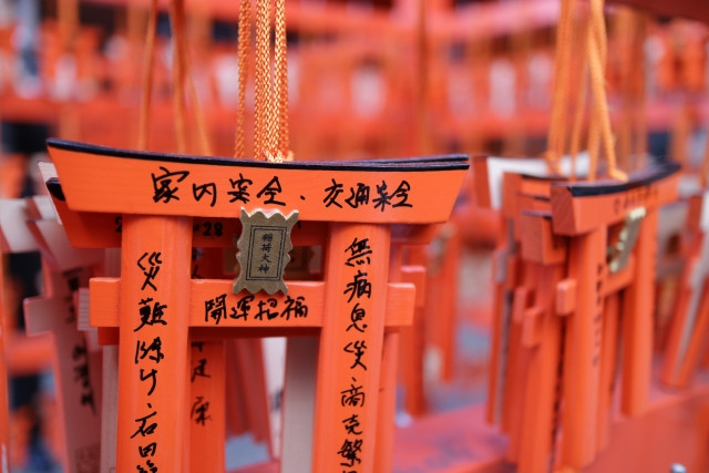 Ada ema yang berbentuk menyerupai gerbang torii khas Fushimi Inari dan ada juga yang berbentuk rubah. Tulis permintaan apapun di ema ini kemudian gantungkan itu di tempat khusus di kuil ini agar para Dewa bisa mengabulkan permintaan tersebut.