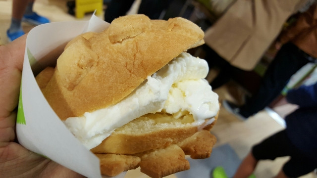 Di wilayah Kansai, tepatnya di Osaka, kamu akan menemukan Amerikamura ("Desa Amerika"), sebuah distrik hiburan yang dipenuhi toko ritel bergaya Amerika dan anak-anak muda. Di distrik ini, kamu akan menemukan persatuan yang mulia antara rasa Amerika dan keunikan Jepang: hot dog es krim! Bukan menggunakan roti hot dog biasa, kamu akan mendapatkan "roti manis" yang dimaniskan. Dan sebagai pengganti sosis hot dog, roti diisi dengan es krim yang terbuat dari susu Hokkaido kemudian digoreng. Tertarik untuk mencoba?