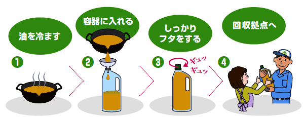 Dalam pengelolaan sampah di Jepang, minyak bekas pakai harus dipadatkan dengan koagulan, atau direndam ke kain atau kertas dengan daya serap tinggi sebelum dibuang. Jangan membuang minyak ke saluran air begitu saja, karena membuat dampak yang buruk bagi lingkungan. Kamu juga bisa membuang minyak bekas masak dalam kelompok sampah bakar dengan menuangkan minyak ke dalam wadah plastik dan diberikan ke petugas. Limbah minyak bisa didaur ulang kembali menjadi sabun, pangan hewan, pupuk hingga bahan biodiesel dengan menyumbangkan minyak bekas pakai ke wadah dan diserahkan kepada petugas yang bertanggung jawab. Pastikan minyak goreng yang Anda buang dalam keadaan dingin untuk mencegah kebakaran.