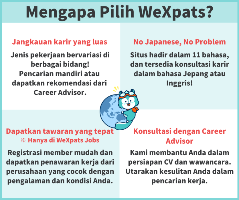 WeXpats Jobs merupakan situs khusus lowongan paruh waktu bagi tenaga kerja asing yang tinggal di Jepang. Anda dapat mencari pekerjaan dalam 11 pilihan bahasa (Indonesia, Inggris, Vietnam, Korea, Mandarin Tradisional, Mandarin Sederhana, Burma, Tagalog, Spanyol, Portugis), termasuk bahasa Jepang. Temukanlah pekerjaan yang tepat sesuai dengan spesifikasi level bahasa Jepang, bidang kerja, lokasi, dan sebagainya.