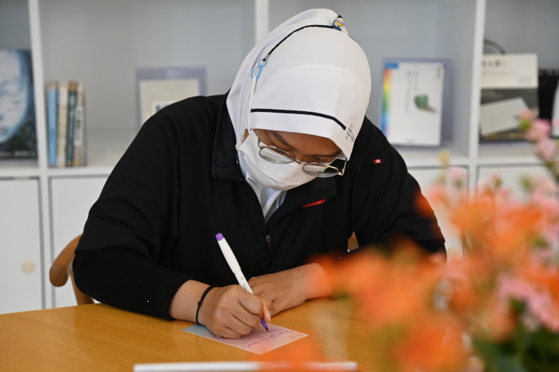 ありがとうございます。おっしゃる通り、このヒジャブは職場に支給された制服です。私たちが働いている桜十字病院はムスリムのスタッフが多くて、職場の日本人も理解がある人が多くて働きやすいですね。