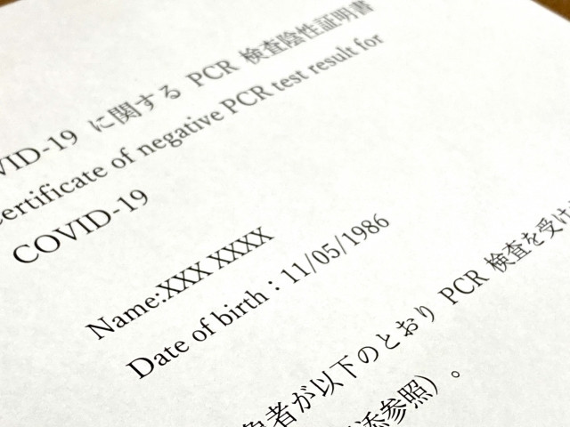 <출국 전 72시간 이내에 해야 하는 PCR 검사 증명서의 포맷(일본 후생 노동성 제공)>[2페이지의 샘플을 참고해 1페이지에 기재]