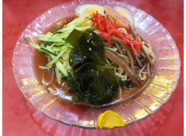한국의 ‘콩국수’ 정도의 존재감으로 여름 음식을 대표하는 메뉴인 ‘히야시츄카(冷やし中華)’. 여름이 되면 가게 내외부에 ‘冷やし中華’라고 쓰인 종이가 나붙는 것도 재미있습니다. 한국의 중국 냉면보다는 국물이 자작한 것이 특징입니다. >> ‘히야시츄카’ 기본 지식
