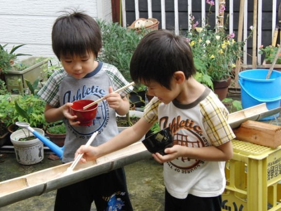 ‘소멘(そうめん、素麺)’은 한국의 ‘소면’과 같은 종류의 면입니다. 이 소면을 삶아서 차가운 물에 헹군 소면을 이 미끄럼틀 같은 곳에 태워 흘려보내면서(流し) 젓가락으로 쏙쏙 낚아 채가며 먹는 재미있는 요리를 ‘나가시소멘(流しそうめん)’이라고 합니다. ‘흘림 소면’ 정도의 의미인데요. 전통적으로는 대나무를 반으로 자른 죽통에 물을 흘려보내는데, 1950년대 일본 규슈 지방 미야자키현(宮崎県)에서 처음 이런 방식으로 먹기 시작했다고 전해지고 있습니다.