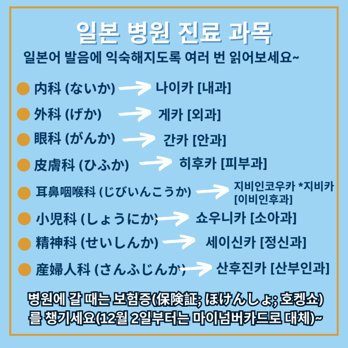 일본의 의료보험증은 현재 ‘마이넘버카드’와 일체화되고 있습니다. 2024년 12월 2일 이후에는 건강보험증이 발급되지 않고, 이후에는 마이넘버카드만 이용할 수 있으니 참고해주세요. >> 마이넘버카드 안내
