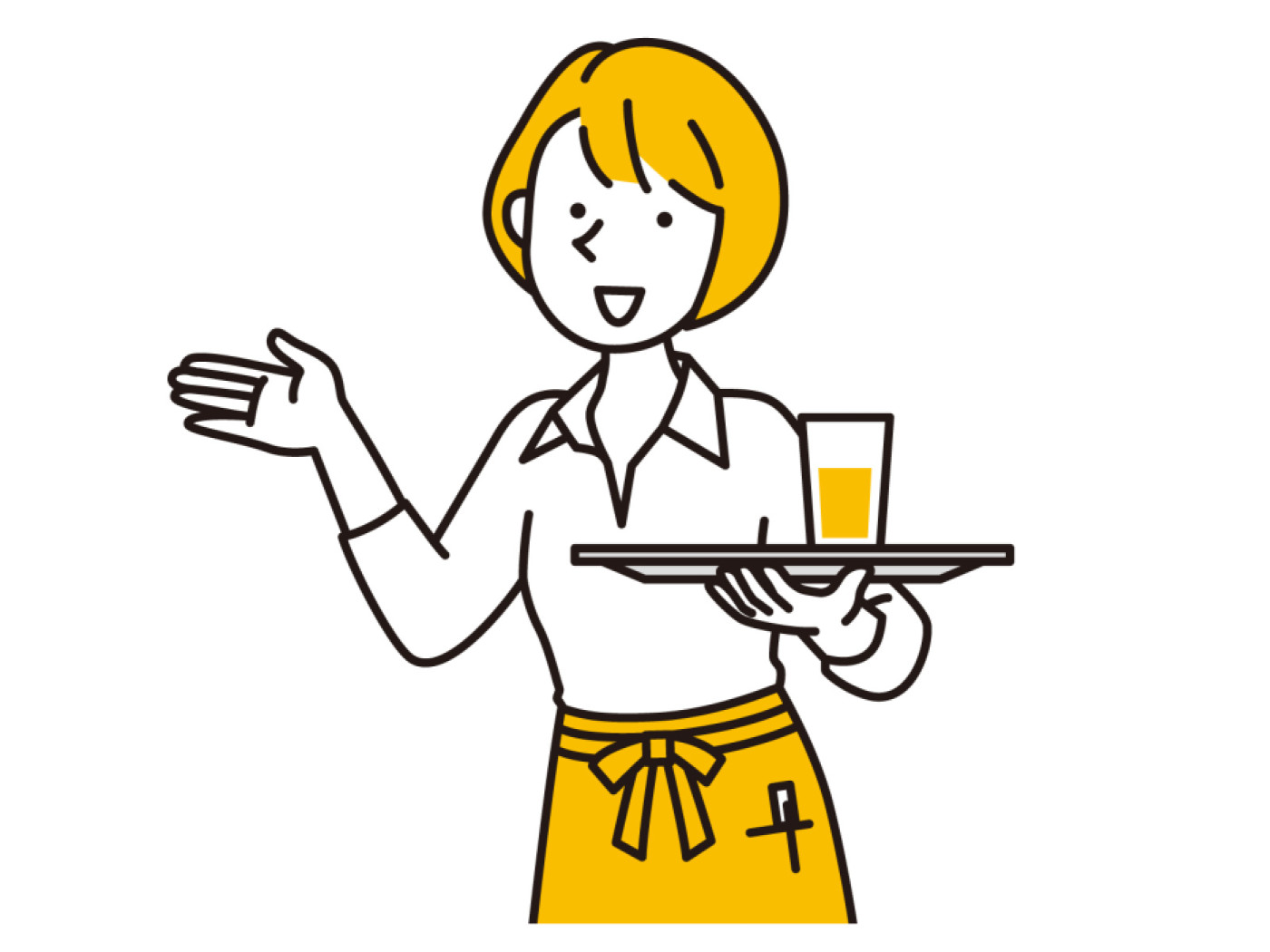 홀 스태프(ホールスタッフ)란, 웨이터, 웨이트리스 또는 테이블 서비스 스태프를 말합니다. ‘서빙’이라고도 표현하는 포지션입니다. 고객을 맞아 자리로 안내하고, 주문을 받고, 주문한 음식을 자리까지 서빙하고, 테이블을 정리하는 일을 맡습니다. 가게의 방침에 따라서는 홀 스태프가 계산대 업무를 담당하기도 합니다. (점포에 따라 풀타임 스태프만 계산을 맡기도 합니다.)