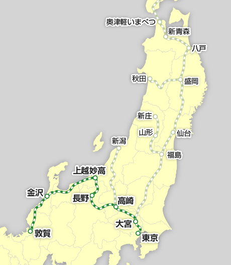 호쿠리쿠신칸센(北陸新幹線)의 주요 역: 도쿄역(도쿄도)~가루이자와역(나가노현)~죠에츠묘코역(니가타현)~도야마역(도야마현)~가나자와역(이시카와현)~후쿠이역(후쿠이현), 쓰루가역(후쿠이현)