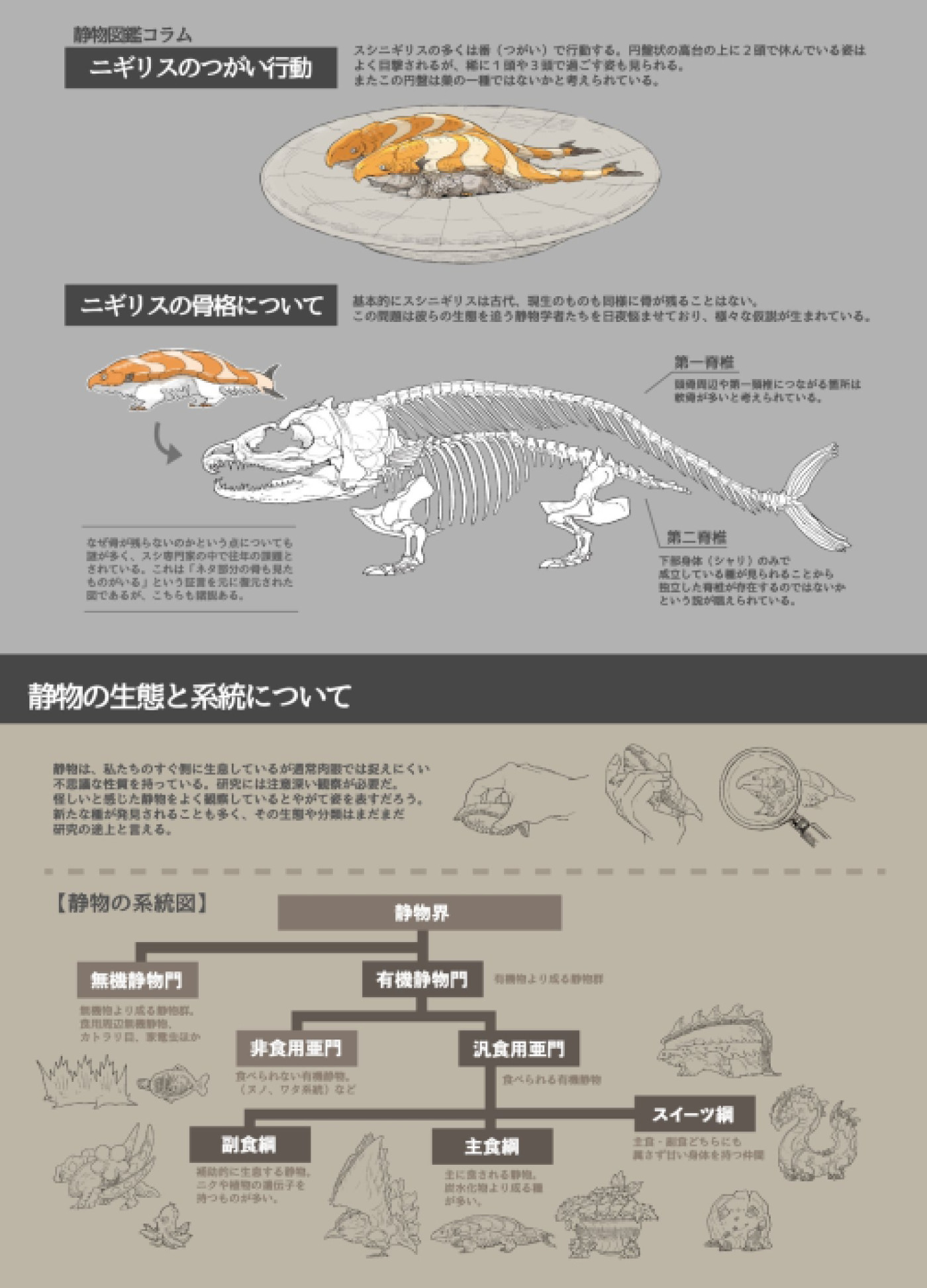 “생물 도감(生物図鑑)”과 일본어 발음이 똑같고 한자가 다른 “정물 도감(静物図鑑)”이라는 책 제목, “니기리목 스시과(二ギリ目スシ科)”라는 생물 분류 방식을 따른 분류 등 도감 독자와 스시 팬들을 모두 만족시킬 만한 디테일한 설명이 감탄을 자아냅니다.