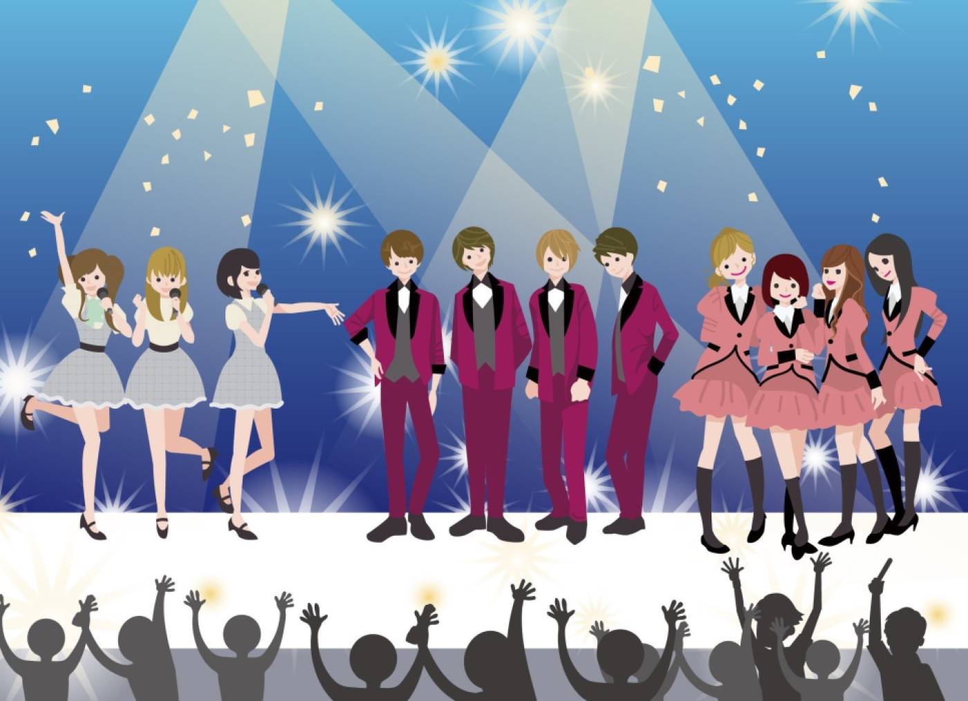 일본 아이돌은 춤추고 노래하는 아티스트. 팬과 아주 친밀한 관계를 쌓아나갑니다. 그들은 ‘콘셉트’나 ‘테마’를 갖고 있는 경우가 많고, 주로 그룹에 소속되어 활동합니다. 일본 아이돌은 활동의 폭이 넓습니다. 연기에 도전하고, 해설자나 게임 참가자로 텥레비전 방송에도 출연하고, 라디오 방송의 DJ로도 활약합니다.