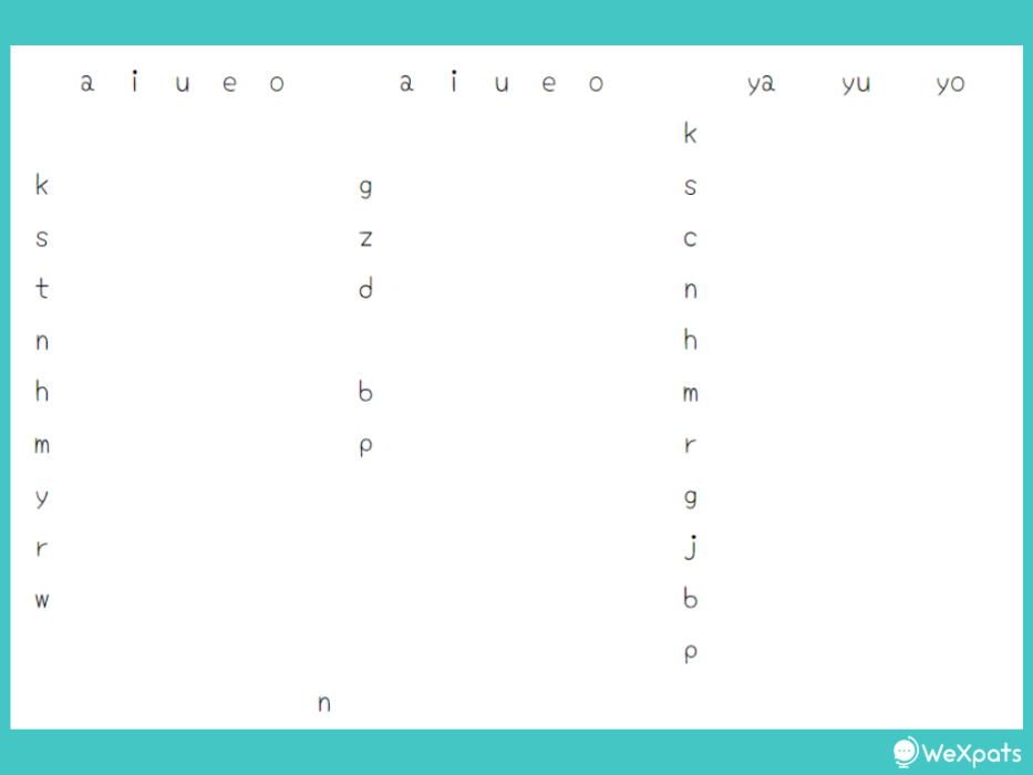 히라가나와 가타카나를 전부 외우셨나요? 언제든 떠올릴 수 있을 정도로 자신이 있으신가요? 히라가나표, 가타카나표는 실수 없이 외울 때까지 반복해서 쓰는 것을 추천드립니다. 다음과 같이 자음과 모음만 표에 쓰는 것부터 시작~