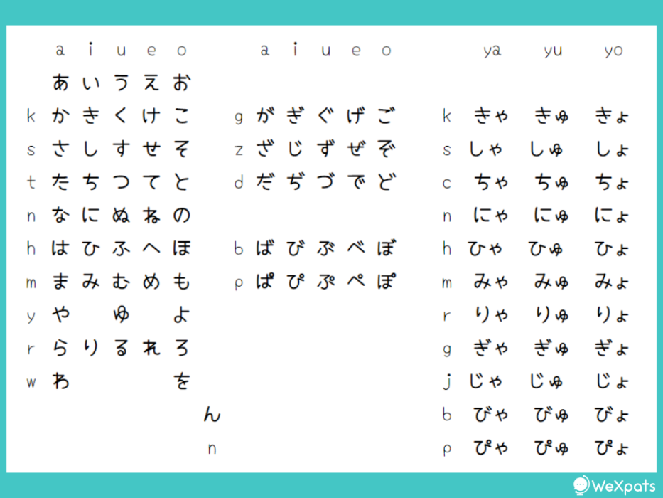 일본어 가나를 가로에 모음 5개, 세로에 자음 10개를 기준으로 정리한 것을 ‘50음(五十音; 고쥬온)’, 또는 ‘50음도(五十音図; 고쥬온즈)’라고 합니다. 단 ヤ(야)행의 イ단, エ단, ワ(와)행의 イ・ウ・エ단은 중복되어 오늘날에는 공백으로 두며(아래 표 참고) 공백까지 포함해 50칸이기 때문에 ‘50음’이라고 부르고 있습니다(‘ん’은 50음에는 포함하지 않음). 인터넷 등을 검색할 때 가끔 만나게 되는 ‘50음순(五十音順; 고쥬온쥰)’이란 이 50음도를 위에서 아래로, 왼쪽에서 오른쪽으로 읽는 순서를 말합니다. (あーいーうーえーおーかーきーくーけーこ…)