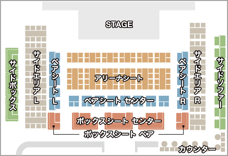 원하는 공연을 결정했으면 ‘시트(シート)’, 즉 ‘좌석’ 종류를 결정합니다. 공연별로 ‘뮤직 차지(MUSIC CHARGE)’, 즉 ‘음악 요금’이 설정되어 있는데요. 시트(좌석)에 따라서 함께 앉을 수 있는 인원과 요금이 조금씩 다릅니다. ‘사이드 에어리어 L/R’과 ‘카운터’ 시트는 별도의 좌석 추가 요금이 들지 않아 공연 소개와 함께 안내된 ‘뮤직 차지’만 지불하면 ok. 다른 좌석들은 ‘뮤직 차지+시트 추가 요금’으로 가격이 조금 올라갑니다. (좌석 종류는 아래에 그림과 함께 예시를 소개)