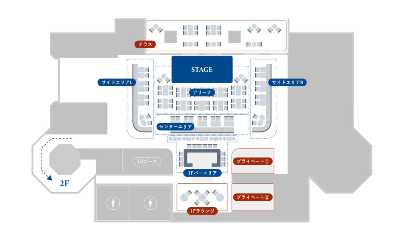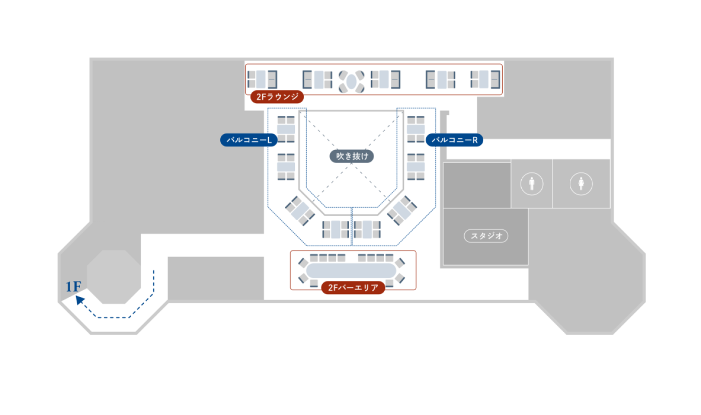[참고] 좌석 설명 중 ‘미키레세키(見切れ席)’는 스테이지의 라이브 공연이 보이지 않는 좌석을 말합니다. 1층의 테라스/프라이빗(반개인실/개인실)/라운지, 2층의 라운지와 바 에어리어인데요. 자리에서 공연이 안 보이는 경우 ‘다치미에어리어(立ち見エリア)’, 즉 서서 공연을 볼 수 있는 공간에서 감상할 수 있습니다.