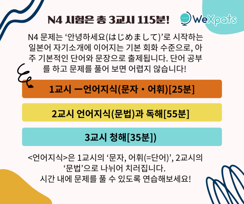 JLPT N4 레벨은 기본적인 단어나 문장을 공부하는 초급 일본어 레벨입니다. N5 레벨과 비교해보면 문법은 조금 더 복잡해집니다.
