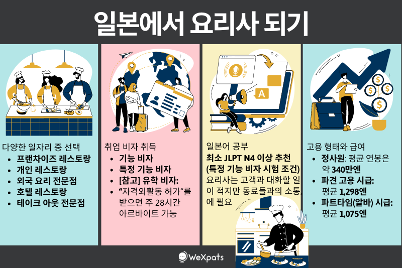 일본 정사원(풀타임) 요리사의 평균 연봉은 약 340만엔, 초봉은 약 240만엔입니다. 아르바이트(파트타임) 요리사의 평균 시급은 1,075엔, 파견 고용 형태로 일하는 요리사의 평균 시급은 1,298엔입니다.
