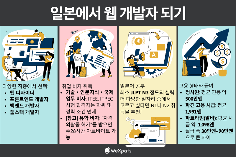 일본 IT업계는 외국인 노동자들에 대한 수요가 높은 분야로 일본 취업을 생각하는 분들 중 많은 분들이 관심을 갖고 계실 것입니다. 일본에서 IT 관련 커리어를 시작하려는 분들을 위해 대표 직종 중 하나인 ‘웹 개발자’를 추천드립니다.