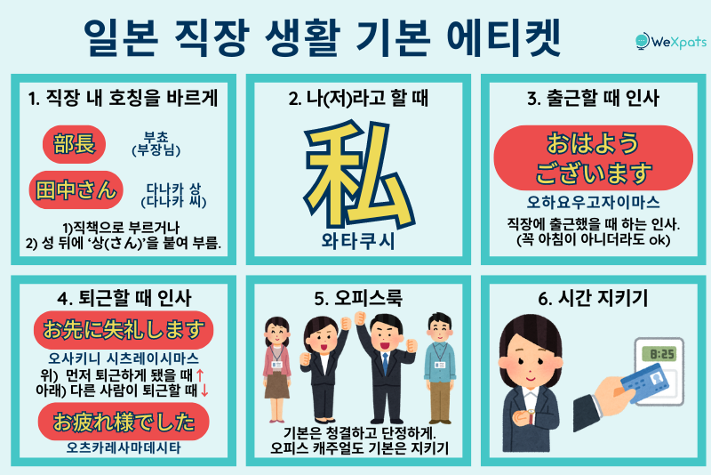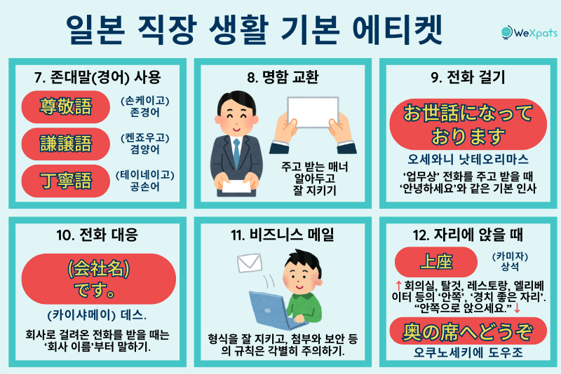 직장 생활의 에티켓과 더불어 비즈니스 상황에서 쓰이는 일본어 표현을 많이 익혀두고 적절하게 사용하는 것은 무척 중요합니다. WeXpats Guide의 기사로 공부해보세요.