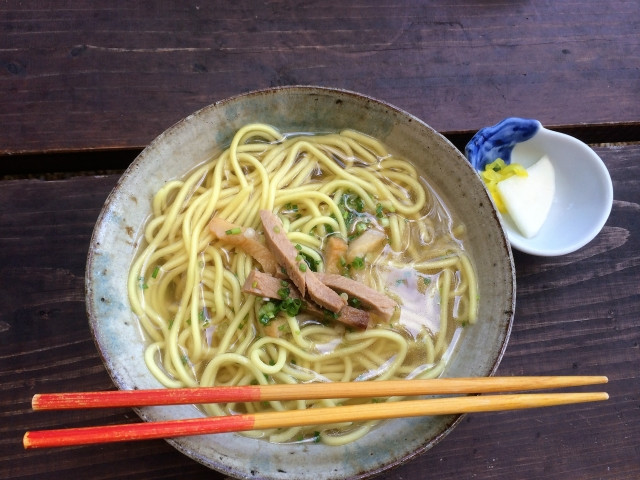 ‘소바(蕎麦、そば)’라고 하면 메밀면으로 된 소바만 생각하는 분들~ 오키나와에서는 소바도 독창적인 맛을 자랑합니다. 소바를 시켰는데 우동보다는 얇고, 라면보다는 두꺼운 굵은 면발의 요리가 나옵니다. 실제로 메밀가루는 전혀 쓰지 않고 밀가루를 쓴 중화면으로 만드니 오키나와 소바, 하면 돼지고기를 넣은 라면, 느낌을 생각하시는 게 좋을 것 같습니다. 메뉴판에 ‘소키 소바(ソーキそば)’와 ‘야에야마 소바(八重山そば)’라고 쓰여 있는 경우도 있는데 이 소바들도 ‘오키나와 소바’들입니다. 소키(ソーキ)는 뼈가 붙은 돼지의 갈비로, 소키 소바는 맑은 국물의 뼈해장국, 감자탕의 이미지랄까요? 야에야마 소바는 오키나와 남쪽의 야에야마 제도(여러 섬들이 모인 지역. 이시가키지마, 다케토미지마, 이리오모테지마 등의 섬들이 속함)에서 먹는 소바입니다. 다시에 조린 돼지고기를 넣어 살짝 단맛이 감도는 것이 매력입니다. 때에 따라서는 얇게 썬 가마보코도 넣습니다.