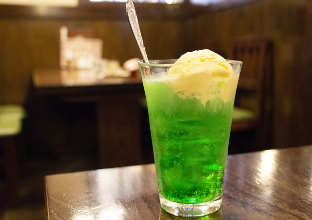 쿠리무소다(クリームソーダ): 한 번 보면 그 색 때문에 꼭 먹어보고 싶어지는 크림소다. 탄산수에 아이스크림을 띄운 플로트 계열이지만, 멜론 시럽을 넣어 초록색 빛을 낸 이 메뉴는 ‘크림소다’, ‘아이스크림소다’, ‘멜론크림소다’ 등으로 불립니다. 여름에 한 번쯤 꼭 먹게 되는 일본 킷사텐의 대표 주자입니다.