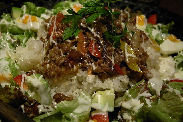 시실리안라이스. 이번에는 이탈리아의 ‘시칠리아’의 이름을 딴 라이스 요리입니다. 흰 밥 위에 매콤달콤한 타레로 볶은 얇은 고기(주로 소고기), 양파, 달걀을 올리고, 레터스, 토마토, 오이 등 야채를 얹은 뒤 마요네즈를 살살 뿌려주면 완성!