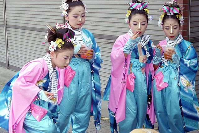 신에게 바치는 제의인 ‘마쓰리(祭り)’에서는 화장으로 ‘성스러움’, ‘비일상’을 표현하며 ‘세속’, ‘일상과는 다른 상태임을 표현했습니다. 두꺼운 화장을 하고 마쓰리에 참여하는 소년소녀들, ‘치고(稚児)’가 이를 대표적으로 보여줍니다.