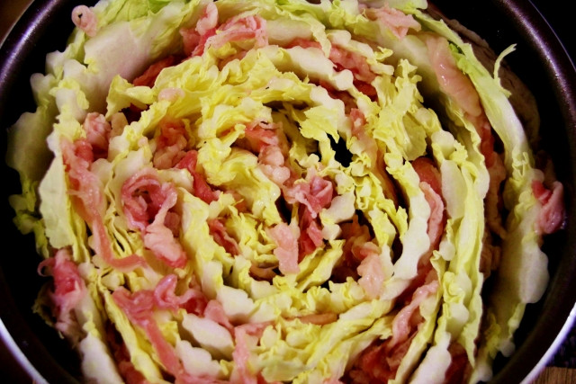 부타바라(豚バラ), ‘삼겹살’과 하쿠사이(白菜), ‘배추’를 겹겹이 포개(重ね) 끓이는 밀푀유 나베. 일본에서는 ‘豚バラと白菜の重ね鍋(부타바라토하쿠사이노카사네나베)’라고도 부릅니다. 프랑스어로 ‘1000’을 뜻하는 ‘mille’과 ‘잎’을 뜻하는 ‘feuille’이 더해진 ‘밀푀유’는 바삭바삭한 얇은 파이가 겹겹이 층을 이루는 과자를 부른 이름인데, 한국과 일본에서는 ‘밀푀유 나베’가 유행, 어엿한 나베 요리로 자리잡고 있습니다. 한국에서는 소고기를 많이 사용하지만, 일본에서는 돼지고기 삼겹살로 만드는 것이 기본~ 일본에서는 2010년 다시 제품의 CM에 등장하기도 했습니다.