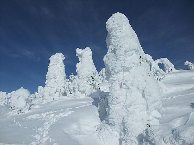 일본의 도호쿠(東北) 지방의 중앙부, 미야기현(宮城県)과 야마가타현(山形県)에 걸쳐 있는 화산인 자오산. 표고는 1,841미터입니다. 아이치현에 같은 이름의 산이 있어, ‘자오연봉(蔵王連峰)’이라는 이름으로 불리기도 합니다. 세계적으로도 희귀한 ‘수빙 명소’로, 야마가타현 쪽의 자오 온천 스키장(蔵王温泉スキー場)이 가장 알려져 있습니다. 미야기현의 센다이(仙台) 쪽에서도 수빙을 볼 수 있어 당일로 쉽게 보기 위해 센다이 쪽을 찾는 이들도 많다고 하네요.