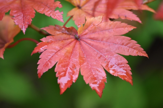 ‘모미지’와 ‘카에데’는 모두 ‘단풍나무’를 가리키는 말입니다. 전문적으로는 잎의 모양으로 구분한다고 하는데요. 펼친 손가락 모양 단풍잎의 잎과 잎 사이, 즉 잎이 찢어진 부분(葉の切れ込み; 하노키레코미)가 깊이 파여 있으면 ‘모미지’, 잎과 잎 사이가 얕으면 ‘카에데’라고 부릅니다.