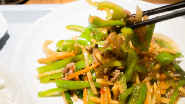 모습을 보면 ‘고추잡채!’ 하는 반응이 나오는 칭자오로스. 고추잡채의 꽃, ‘꽃빵’을 좋아하시는 분들은 아쉽겠지만, 일본에서는 밥과 함께 먹습니다. 한국의 고추잡채보다 조금 덜 맵고 순해서 밥과 잘 어울립니다. 피망과 돼지고기(소고기인 경우도 있을 수 있음)를 잘게 채썰어 볶은 요리입니다.