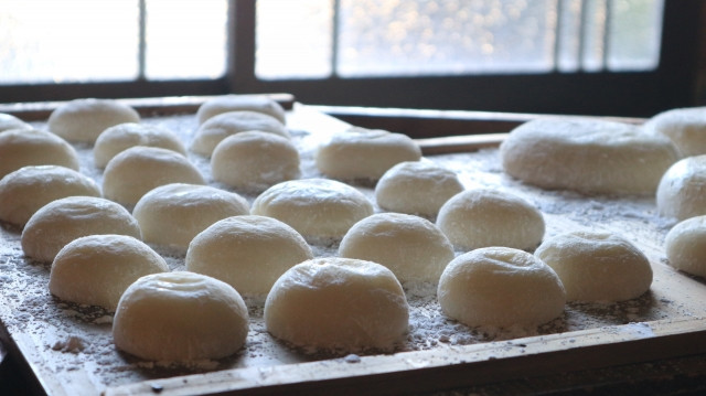 이렇게 떡을 찌으면 둥글평평하게 카가미모치를 빚습니다. 카가미모치 빚는 날은 12월 28일이 일반적이라고 하는데요. 29일은 ‘9’의 발음이 ‘고통’, ‘괴로움’을 상징하는 '苦(く)'와 발음이 같아 피하고, 31일은 신년에 각 가정을 찾아오는 신인 '토시카미(年神)'라는 신을 맞이하는 날로, 신에게 바치는 카가미모치를 하룻밤만 장식하는 것은 좋지 않다고 하여 피한다고 합니다. '8(八)'은 끝부분이 넓어져 길한 숫자로 불리니 가능하면 28일이 좋겠죠? 카가미모치를 사서 장식하는 경우에도 28일에 사서 장식하면 됩니다.