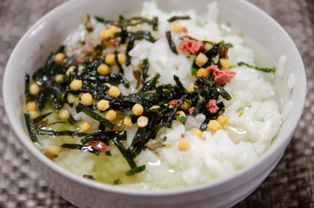 お茶漬け海苔(오차즈케노리): ‘海苔(노리)’는 김이라는 뜻. ‘오차즈케노리’라고 하면 오차즈케에 넣는 김인가? 생각하기 쉽지만, 나가타니엔(永谷園)의 일본 인스턴트 오차즈케의 브랜드명. 기본 구성은 노리(김), 아라레, 맛차시오(맛차, 소금, 설탕, 콘부차, 조미료 등을 과립형으로 만든 것)로, 뜨거운 물을 부으면 오차즈케 완성!