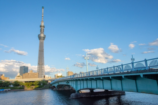 갓파바시의 중간 지점쯤에서 ‘호초(包丁)’, 즉 칼 전문 상점들이 있는 골목 쪽으로 접어들면 ‘도쿄 스카이트리’가 보입니다. 왠지 저기까지 걸어가보고 싶다! 하는 생각이 들게 하는데요. 걸어서는 약 30~40분 정도 소요됩니다. ‘스미다가와(隅田川)’와 ‘고토토이바시(言問橋)’를 지나게 됩니다.