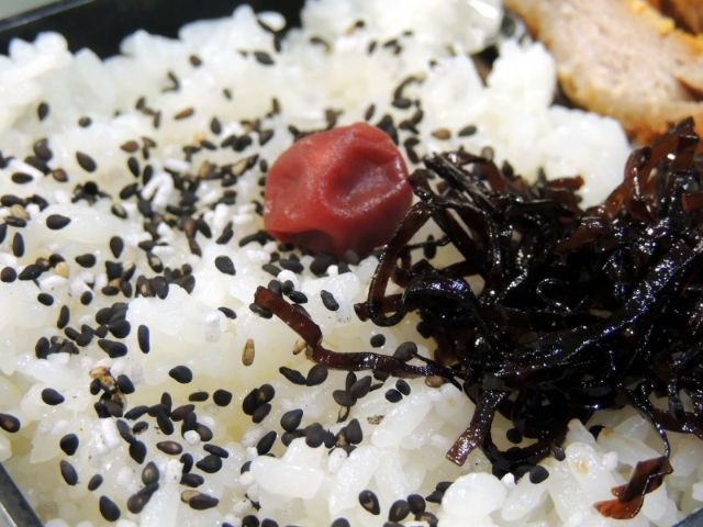 ‘노리벤(のり弁)’이라는 약자로 많이 불리는 ‘노리벤또(のり弁当)’. 일본에서 가장 대중적인 벤또입니다. ‘사카나후라이(魚フライ)’, 즉 ‘생선튀김’이 눈에 띄지만 이 벤또의 주인공은 간장으로 맛을 낸 ‘이타노리(板のり; 판에 얇게 펴서 건조시킨 김)’. 쌀밥 위를 덮듯 김을 까는데, 쌀밥과 쌀밥 사이에 김을 끼워 층을 나누는 경우도 있습니다.